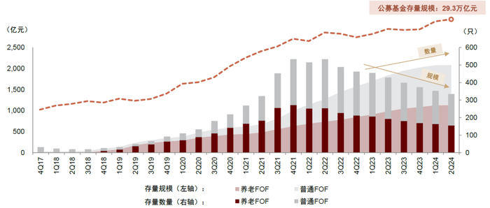 • 困境期(2022年至今):2022年下半年以来,虽然公募基金市场规模整体呈现持续扩张态势,然而公募FOF市场却面临着“存量数量上行、存量规模下降”的困局。一方面,机构布局热情延续,另一方面,产品的市场热度有所降温。在此期间,公募FOF市场规模下降或受到多重因素的叠加影响,包括权益市场行情走弱下的赚钱效应退坡、前期管理业绩未达预期、管理模式的投资者接受度尚待提升等。截至2024年二季度末,公募FOF存量产品数量上行至499只,然而存量规模已下行至1,395亿元,其中,相较于2021年末,养老FOF规模下行43%,数量增长78%;普通FOF规模下行31%,数量增长159%。