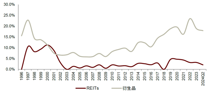 REITs市场在美国较为成熟,但美国公募FOF中对REITs资产的配置并不高,配置REITs的公募FOF产品个数占比长期不超过5%。相较之下美国FOF对于衍生品的利用程度较高,从2003年开始呈现逐步提升的趋势,截至2024H1,18%的美国公募FOF在管理投资中使用衍生品工具。其中利用较多的衍生品工具包括股指期货,收益互换,利率互换,股指期权,债券期货,股票期权等。