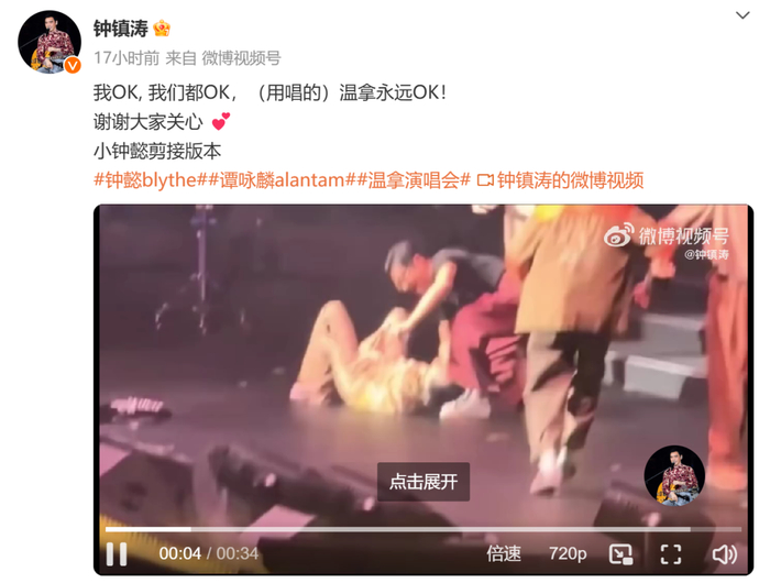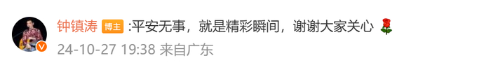 10月27日晚,钟镇涛本人发文报平安,他表示:我OK,我们都OK,(用唱的)温拿永远OK!谢谢大家关心。同时附上了自己现场摔倒的视频,在评论区幽默回应:平安无事,就是精彩瞬间,谢谢大家关心。