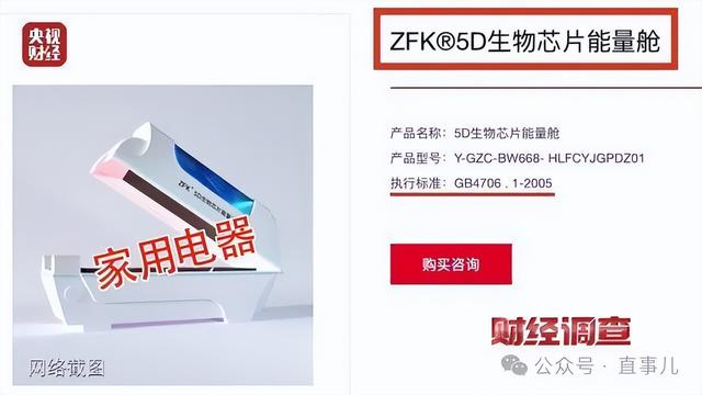尽管这类能量舱都在宣传对疾病的治疗效果,但店里的工作人员却都拿不出产品的任何医疗器械证明。通过进一步调查记者发现,荟生公司官网上显示,他们的这款“ZFK-5D生物芯片能量舱”执行的生产标准为GB4706.1-2005,也就是家用电器的国家标准。
