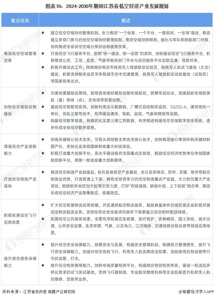 2024-2030年期间,江苏省将从“六项重点任务”发展低空经济产业,分别是推动低空空域管理改革、加快低空基础设施建设、增强低空产业创新能力、打造低空制造产业高地、积极拓展低空飞行应用场景以及提升综合服务保障能力。具体内容如下: