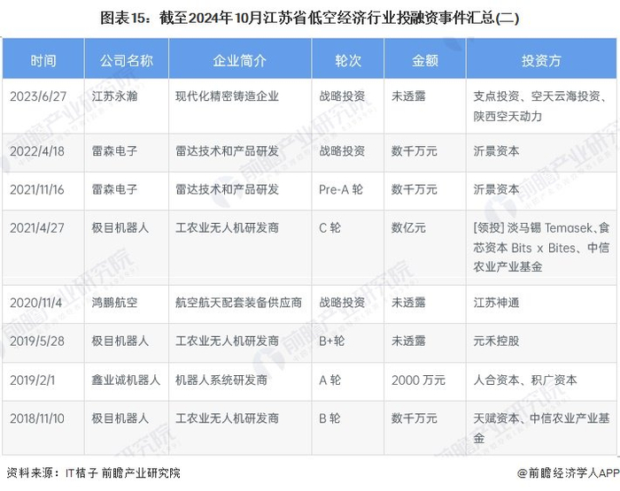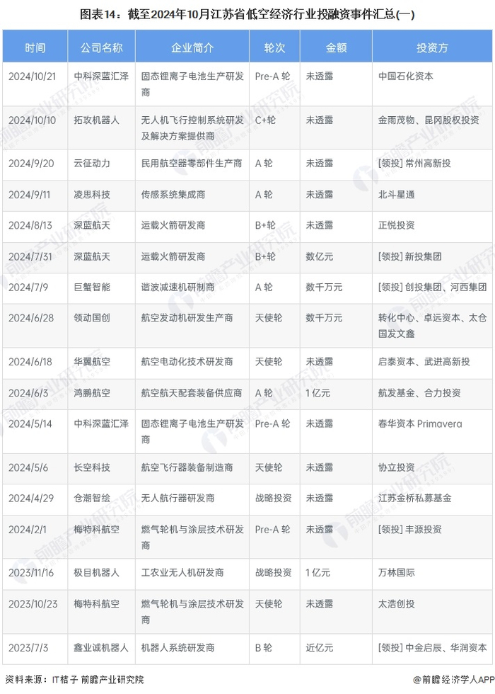 2024年以来江苏省低空经济行业投融资事件汇总如下: