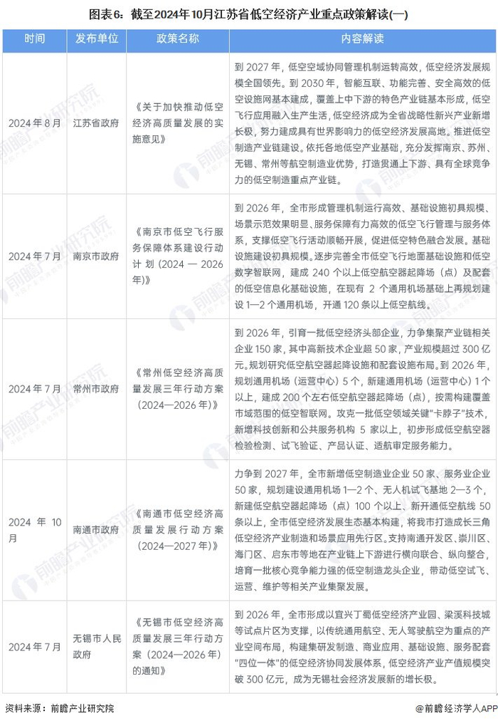 2024年,各市制定了一系列低空经济高质量发展的指导性政策,主要是以苏南地区为主实施从2024年开始的三年行动计划。2024年8月,江苏省人民政府颁发《关于加快推动低空经济高质量发展的实施意见》,是全省首部关于低空经济的政策,目标是到2027年,全省低空空域协同管理机制运转高效,低空经济发展规模全国领先。