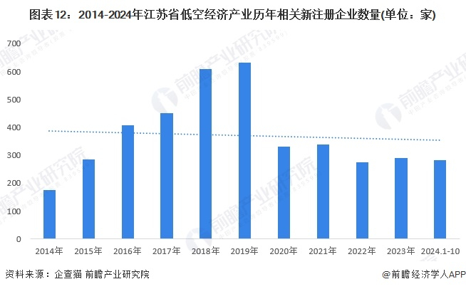 根据企查猫查询数据显示,近年来低空经济产业历年新注册企业数量也快速增长。截至2024年10月,江苏低空经济产业相关的注册企业超2000家,其中2019年新注册企业数量创历史高峰,超过600家;2020年开始江苏省低空经济企业逐步转向高质量发展。2023年全年,江苏省新增低空产业相关企业数量为290家。2024年前10月,低空经济新成立企业超过280家,接近2023年全年水平。