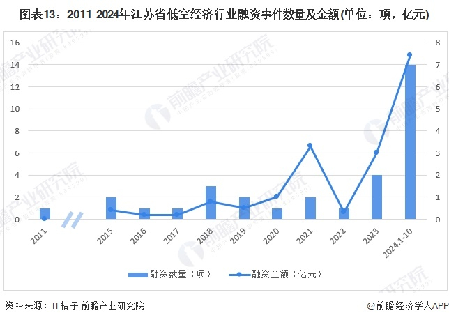 从2011-2024年江苏省低空经济行业相关融资事件数量及金额情况来看,该行业融资整体呈现波动趋势,超过亿元规模的年份有2020年、2021年以及2023年。但每年事件数量相对较少,投资相对谨慎。但2024年开始投融资热度激增,1-10月融资金额创新高,达7.42亿元,投融资数量14件。