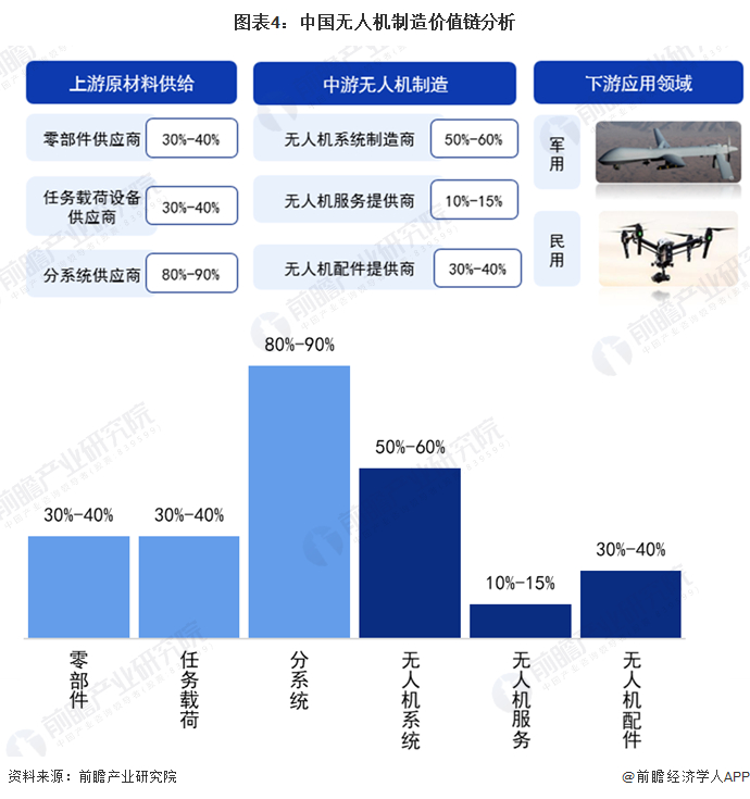 根据无人机各产业链环节的毛利率情况可知,上游无人机分系统供应商的毛利率较高,大多在80%-90%之间;中游环节,无人机系统制造商的毛利率较高,基本在50%-60%之间,行业盈利能力较强;无人机服务提供商的毛利率较低,在13%左右。