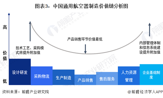 依据技术难度高低、供需现状及潜力,通用航空价值链重点在研发、采购和制造。其中,设计研发、采购与制造环节是通用航空创造价值的主要环节;随着研发技术的提升和产品性能的提升,产品的附加值也随之提升;销售环节相对于生产制造和研发的附加值较低。