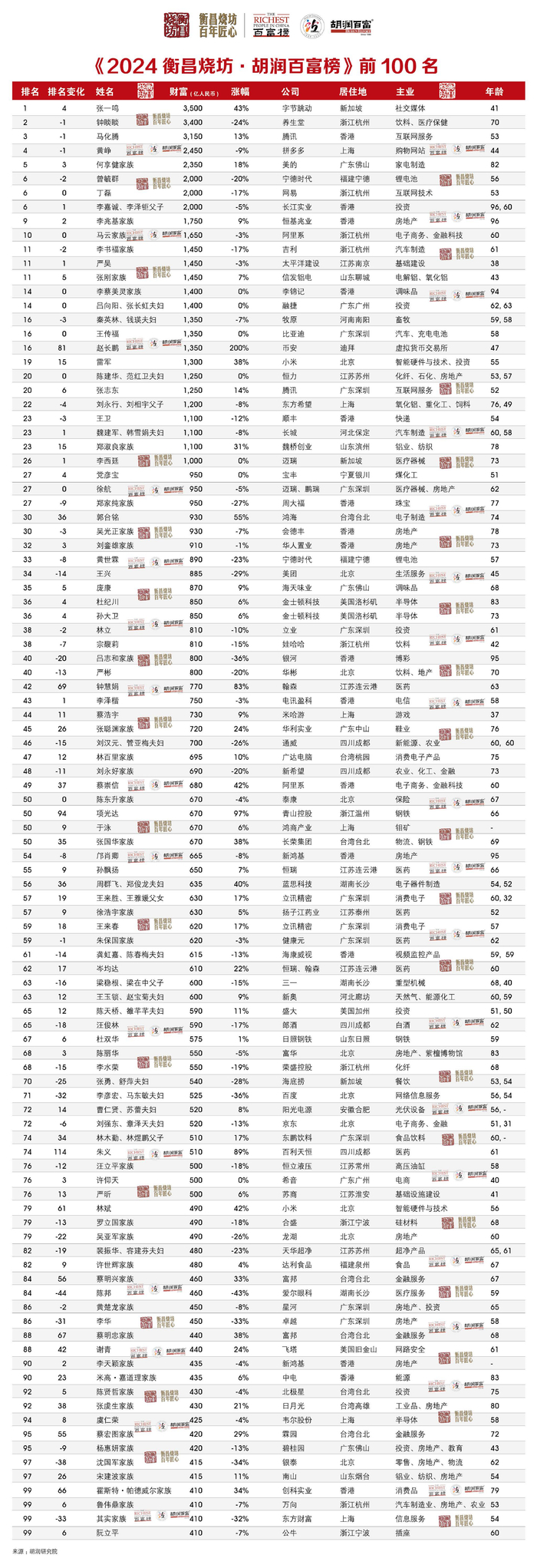 2024胡润百富榜来了!张一鸣钟睒睒马化腾位居前三甲,宗馥莉成中国女首富