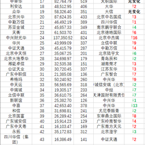 名次变化其次的是33,一家新疆宏昌天圆有限责任会计师事务所收入增加了1072.85万元,上升了33名;一家湖南建业会计师事务所(特殊普通合伙)收入增加了489.08万元,排名下降了33名!
