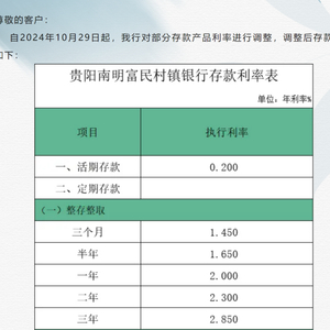 贵阳南明富民村镇银行自10月29日起下调部分存款产品利率,其中3个月、半年、1年、2年、3年期整存整取存款利率分别下调30个、28个、15个、26个、25个基点,至1.45%、1.65%、2.00%、2.30%、2.85%。活期存款利率未作调整,仍为0.20%。