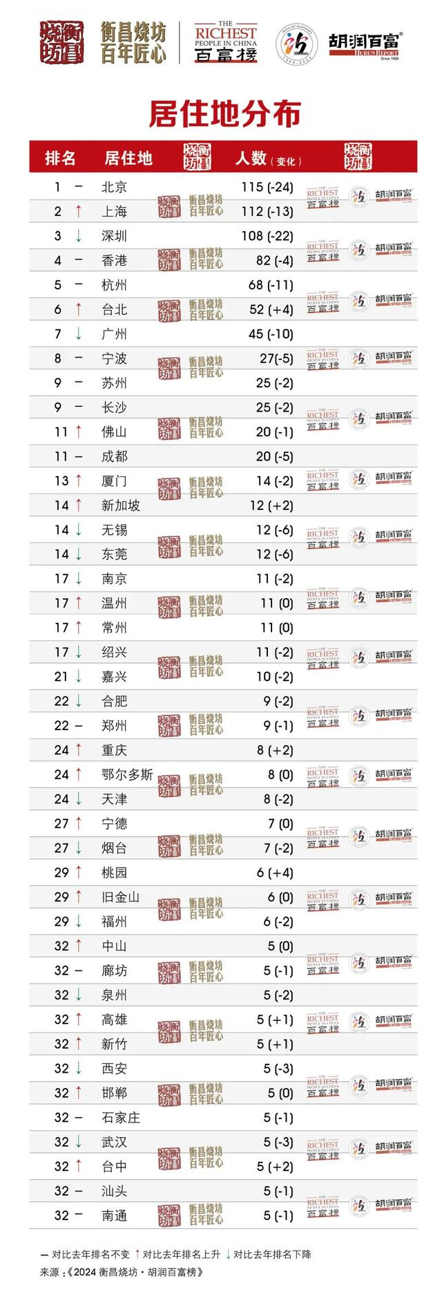 在地域分布上,上榜企业家最集中的城市依然是北京、上海和深圳。其中,北京以115位上榜企业家位居榜首,虽然比去年减少了24位,但仍然保持领先地位。上海则以112位上榜企业家紧随其后,超越了深圳的108位,成为第二。香港和杭州分别以82位和68位位列第四和第五。
