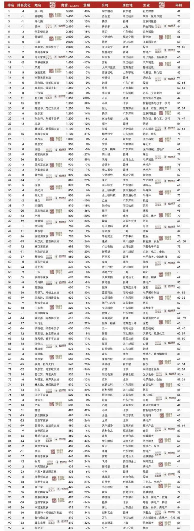 今年最大的亮点是张一鸣以3500亿元的财富首次成为中国首富。他的财富比去年增长了1050亿元,显示出其强大的财富增长能力。而70岁的钟睒睒则以3400亿元的财富位列第二。马化腾的财富也比去年上涨了350亿元(13%),以3150亿元位列第三。44岁的黄峥财富比去年减少了250亿元(9%),以2450亿元位列第四,比去年下降了一位。此外,82岁的何享健及其家族财富也比去年上涨了350亿元(18%),以2350亿元位列第五。56岁的曾毓群和丁磊的财富则均比去年缩水,分别以2000亿元的财富位列第六。而李嘉诚及其长子李泽钜的财富也下降了5%,同样以2000亿元位列第六。李兆基则以1750亿元的财富首次进入前十名。