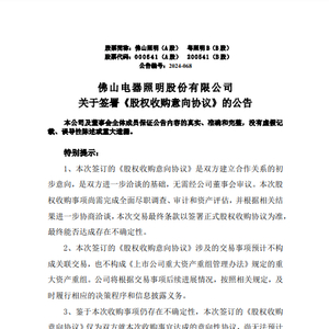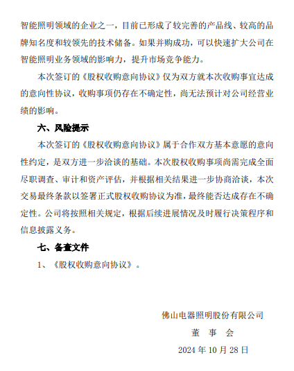 对于本次收购,佛山照明表示随着信息技术的发展及国家陆续出台的政策鼓励,照明行业正加速向智能化、健康化、绿色化转型,为抢抓发展机遇,公司拟通过收购易来智能加快在智能照明方面的布局。易来智能作为国内最早进入智能照明领域的企业之一,目前已形成了较完善的产品线、较高的品牌知名度和较领先的技术储备。如果并购成功,可以快速扩大公司在智能照明业务领域的影响力,提升市场竞争能力。本次签订的《股权收购意向协议》仅为双方就本次收购事宜达成的意向性协议,收购事项仍存在不确定性,尚无法预计对公司经营业绩的影响。