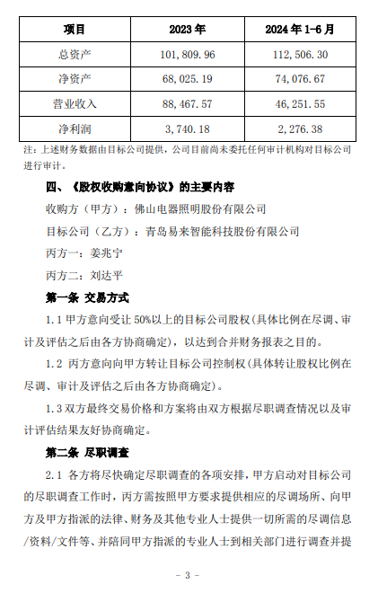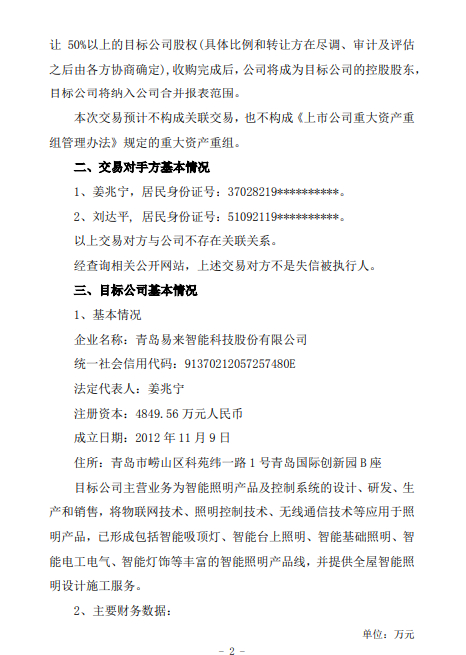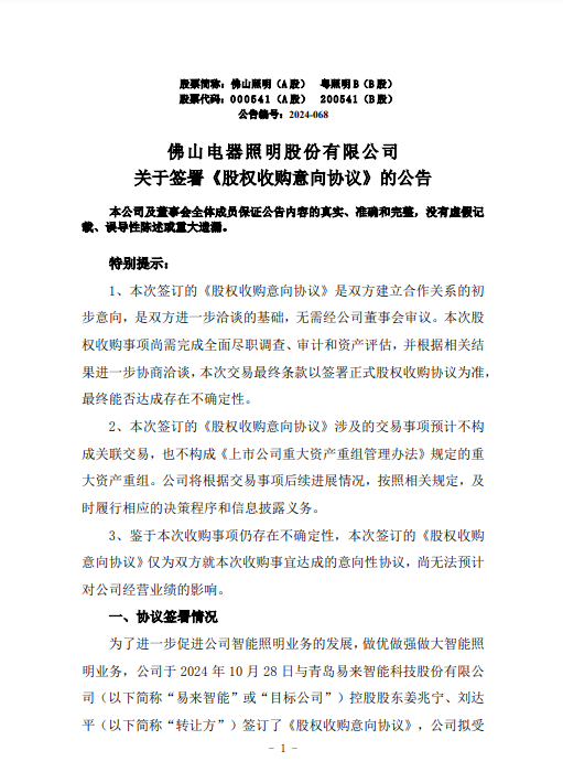 10月29日,佛山照明(000541)披露公告称,公司于10月28日与青岛易来智能科技股份有限公司(以下简称“易来智能”)控股股东姜兆宁、刘达平签订了《股权收购意向协议》,公司拟受让50%以上的目标公司股权,收购完成后,公司将成为易来智能的控股股东,易来智能将纳入公司合并报表范围。