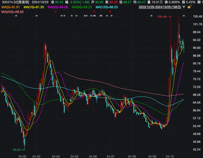 据了解,此次景嘉微定增募资超38亿元,发行价格为59.91元/股。该股近期涨势较猛,尽管10月29日午间收盘下跌2.05%,但根据最新股价90.53元/股,参与定增的投资者阶段性浮盈仍超51%。