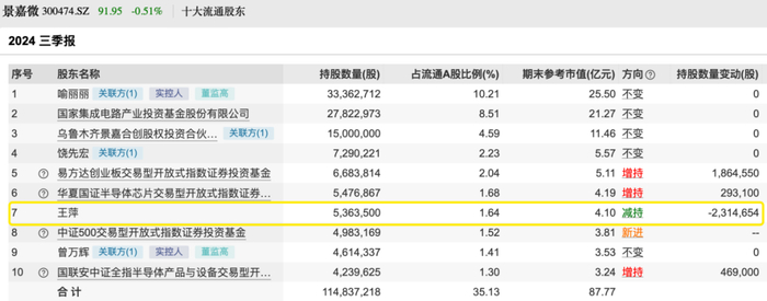 基金君留意到,根据最新披露的三季报,截至今年9月30日,牛散王萍仍然现身景嘉微的前十大流通股东名单,持有该股536.35万股,较二季度末减持231.47万股,三季度末持股市值为4.10亿元,位列第七大流通股东。