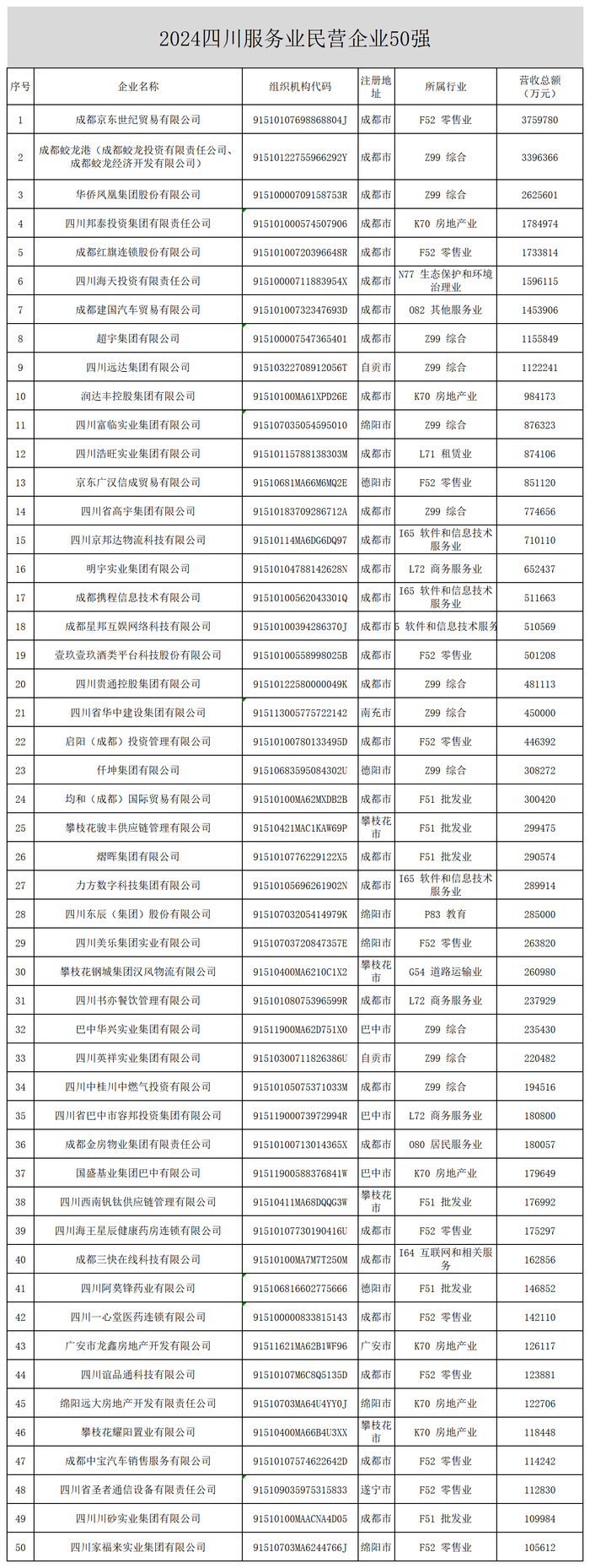 2024四川服务业民营企业50强榜单前5分别是:成都京东世纪贸易有限公司、成都蛟龙港、华侨凤凰集团股份有限公司、四川邦泰投资集团有限责任公司、成都红旗连锁股份有限公司。
