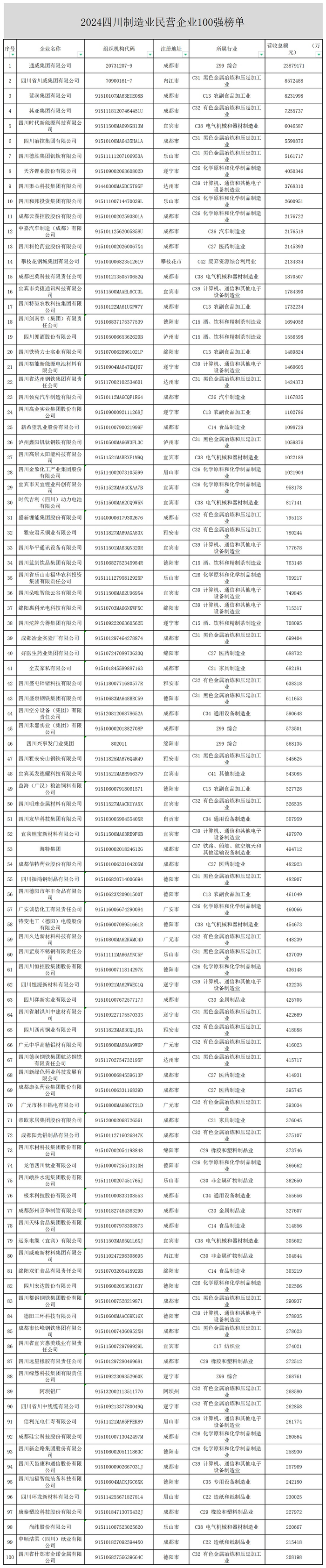 今日,在2024四川民营企业100强发布会上,四川省工商业联合会正式发布了2024四川民营企业100强、制造业100强、服务业50强榜单。据了解,今年是首次发布四川制造业民营企业100强和四川服务业民营企业50强两个榜单。