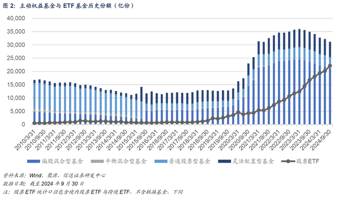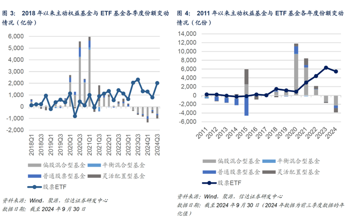 虽然规模止跌回升,但是主动权益基金仍然面临净赎回的问题,其总份额已连续六个季度呈现环比下降的趋势。2024Q3,主动权益基金总份额较上季度末缩减1067.16亿份,环比下降3.31%,降幅相对于2024Q2的2.02%有所扩大。然而,与此同时,ETF市场却展现出了截然不同的增长态势,市场持续扩容,2024Q3股票ETF基金总份额已超过2.2万亿份,环比增长10.02%,较上年同期相比增长32.29%。