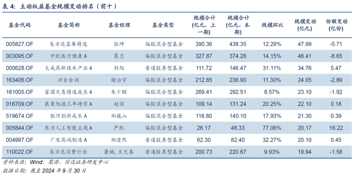 2024Q3,规模增长最高的前五只主动权益基金分别为易方达蓝筹精选、中欧医疗健康A、大成高新技术产业A、兴全合润、富国天惠精选成长A,季度内规模分别增长47.99亿元、46.41亿元、34.76亿元、24.05亿元、23.1亿元。整体来看,规模扩张较多的基金风格分化较为鲜明,覆盖了赛道主题、深度价值等不同投资策略。其中,东方人工智能主题A(严凯)份额增长超过16亿份,实现了较多的净申购。