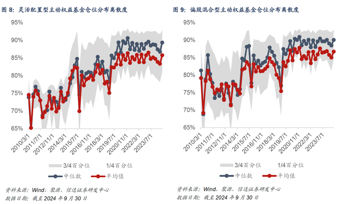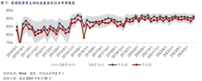 进而,观察普通股票型基金、偏股混合型基金与灵活配置型基金样本池的股票仓位分布情况(考虑到平衡混合型基金样本数量较少,在此不做展示)。2024Q3,各类型主动权益基金的仓位水平普遍提升,仓位分歧度下行。从中位数来看,普通股票型基金、偏股混合型基金、灵活配置型基金的仓位中位数分别较上季度提升1.12pct、1.57pct和2.6pct。