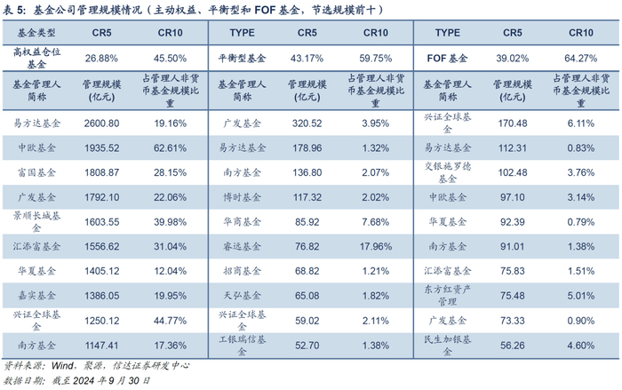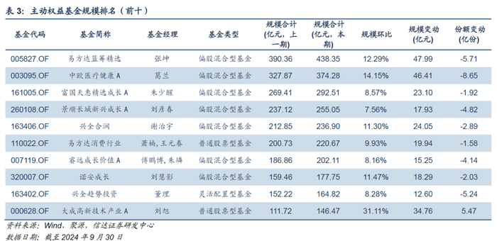 主动权益基金头部管理人竞争格局相对稳定,前十大管理人无变化。截至2024Q3,主动权益基金管理规模排名前五的管理人分别为易方达基金、中欧基金、富国基金、广发基金、景顺长城基金,管理规模分别为2600.8亿元、1935.52亿元、1808.87亿元、1792.1亿元、1603.55亿元。