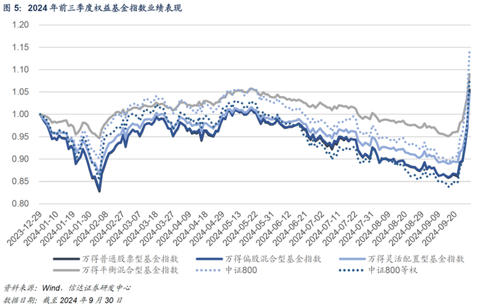 2024Q3,885001指数跑输中证800指数5.42pct;今年前三季度, 885001累计跑输中证800指数9.27pct。季度内,万得普通股票型基金指数(885000.WI)、万得偏股混合型基金指数(885001.WI)、万得平衡混合型基金指数(885002.WI)、万得灵活配置型基金指数(885061.WI)季度收益分别为11.83%、10.68%、6.83%、8.6%。同期,中证800指数(000906.SH)季度收益为16.1%,中证800等权指数(000842.CSI)季度收益为16.48%。