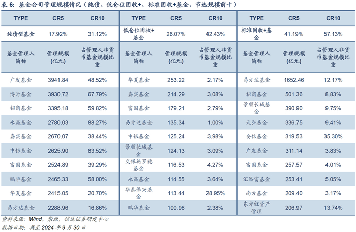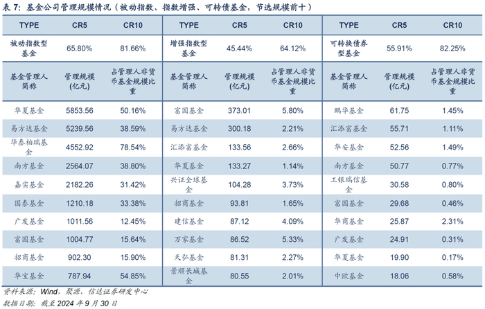 基于基金合同约定的Wind二级投资类型以及历史资产配置情况,我们将全市场基金重新划分为主动权益基金、平衡型基金、标准固收+基金、低仓位固收+基金、纯债型基金、被动指数型基金、增强指数型基金、可转换债券型基金、FOF基金、国际(QDII)基金、另类投资基金、REITs、货币市场型基金。分类的具体规则详见信达金工《公募基金2022Q3季报分析:主动权益基金仓位分歧度提升,增配军工、地产、交运等板块》;在上文基础上,将基金分类调整为以最近一年为依据。考虑到不同基金经理的投资策略差异,历史仓位按照基金经理任职以来进行追溯;对于回看期未满一年的基金样本,使用基金经理任职以来数据进行计算。进而,观察不同类型基金市场的管理人竞争格局。