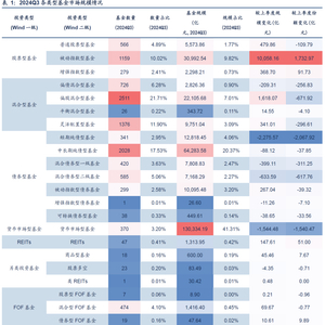 ▶公募基金市场:2024Q3,大量资金借道ETF基金入市,为公募基金市场和权益市场贡献了显著的资金净流入。不考虑联接基金,从份额变化来看,季度内仅被动指数型基金、增强指数型基金、QDII、REITs、商品型基金、债券FOF实现净申购,其余各类型基金均有不同程度的净赎回。新发市场方面,发行热度较上季度有明显下降,中长债仍然是吸金主力,其次是被动指数型债券基金。
