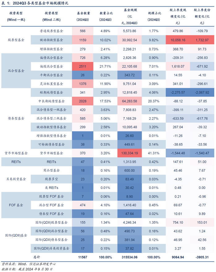 截至2024Q3,剔除非初始基金与联接基金,当前市场存续的公募基金产品共11567只,总规模超过31.55万亿元。基金数量方面,偏股混合型基金以2511只的数量领先;中长期纯债型基金以2028只的数量位居第二;灵活配置型基金则以1376只的数量排在第三位。基金规模方面,货币市场型基金以13.03万亿元的总规模占据绝对优势,规模占比41.31%;其次是中长期纯债型基金,合计规模接近6.43万亿元,规模占比20.37%;第三为被动指数型基金,合计规模3.10万亿元,规模占比9.82%。