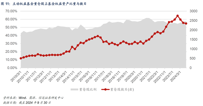 截至2024Q3,主动权益基金持有重仓股市值总和占基金权益资产的57.64%,较上一季度上升0.70pct;全市场主动权益基金经理的重仓股数目为2347只,较上期减少33只,较上年末减少408只。整体来看,主动权益基金的重仓股集中度已连续三个季度保持上行,且重仓股多样性继续下降,主动权益基金经理在重仓个股的选择上的共识有所提升。