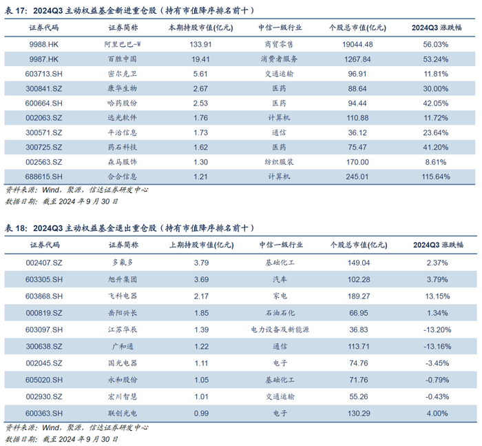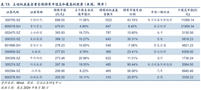 2024Q3,主动权益基金加仓市值排名靠前的个股有中国平安、美的集团、比亚迪、阳光电源、格力电器,主动加仓市值分别为51.55亿元、47.3亿元、42.09亿元、41.99亿元、34.12亿元;主动减仓市值排名靠前的个股有工业富联、泸州老窖、迈瑞医疗、贵州茅台、海尔智家,主动减仓市值分别为-68.89亿元、-65.96亿元、-55.96亿元、-46.32亿元、-43.91亿元。