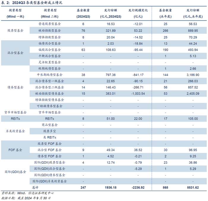 新发市场热度较上季度有明显下降。剔除非初始基金与联接基金,2024Q3新成立基金共247只,新发规模合计1936.18亿元,较上季度下降2236.92亿元。从新发市场结构来看,中长期纯债型基金仍然是吸金主力军,被动指数型债券基金和被动指数型基金也相对较强。