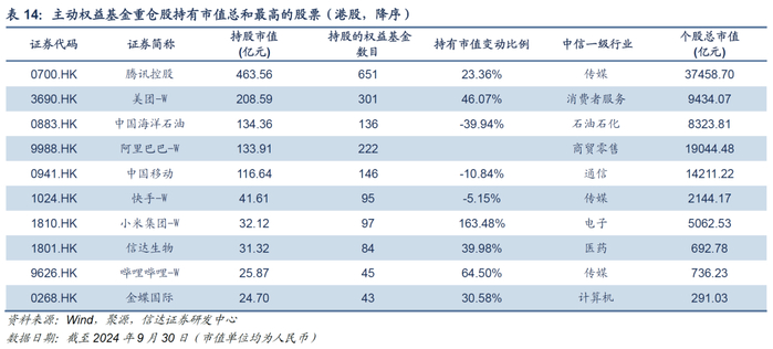 港股配置比例环比明显提升。从主动权益基金对港股市场的配置情况来看,截至2024Q3,主动权益基金配置港股市值总和占基金权益资产的11.37%,较上一季度上升0.8pct。目前,主动权益基金对于港股的配置比例处于2015年以来的历史第三高位。