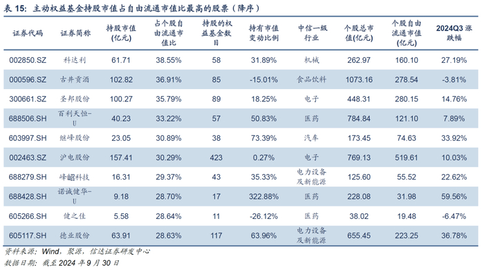 从主动权益基金持有市值占个股自由流通市值比重来看,排名前五的A股分别为科达利、古井贡酒、圣邦股份、百利天恒-U、继峰股份,持仓市值分别占其自由流通市值的38.55%、36.91%、35.79%、33.22%、30.89%。