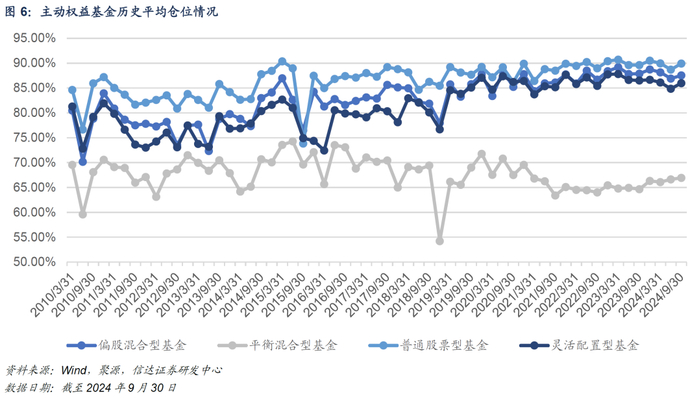 通过权益资产占基金净资产比例的规模加权平均值来衡量全市场主动权益基金对股票资产的整体偏好。截至2024Q3,主动权益基金的平均仓位水平为87.5%,较2024Q2末上升0.88pct,处于2010年以来的81.6%历史百分位。其中,普通股票型基金、偏股混合型基金、灵活配置型基金、平衡混合型基金的仓位分别为89.93%(较上季度+1.23pct)、87.57%(较上季度+0.66pct)、85.97%(较上季度+1.12pct)、66.96%(较上季度+0.31pct),分别处于2010年以来的88.3%、80%、78.3%与41.6%历史百分位水平。