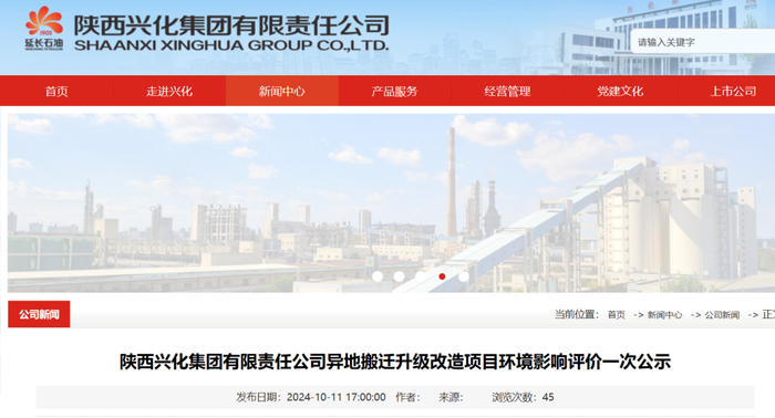 10月11日,兴化集团官网发布《陕西兴化集团有限责任公司异地搬迁升级改造项目环境影响评价一次公示》。公告显示,兴化集团将迁至榆神工业园,新厂址目标是2027年建成投产,现有的兴平2500亩工业园区将保留。