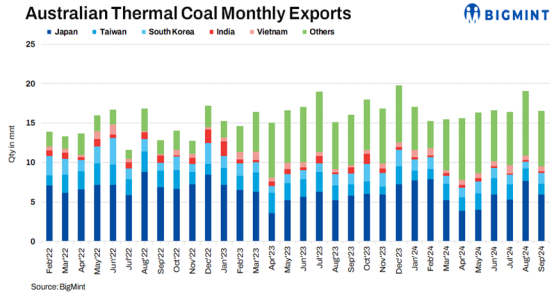 BigMint船运数据还显示,2024年9月,澳大利亚动力煤(非焦煤non-coking coal)出货量1657万吨,环比8月的1905万吨下降13%;而与2023年9月的1610万吨相比,出口量同比增长2.9%。