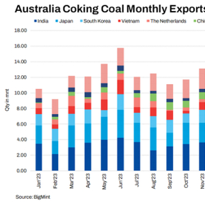 从炼焦煤出口目的地来看,9月份,对印度的炼焦煤出口量从8月份的245 万吨下降至210 万吨,下降14.3%。相反,对中国的出口则显著增长27.8%,从8月的152万吨增至9月的194万吨。对日本的出货量也有所增长,9 月份出货量达到289万吨,增长8.4%。