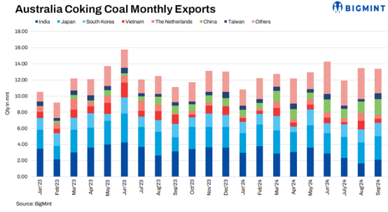据BigMint整理发布的数据,2024年9月,澳大利亚炼焦煤出口发货量为1338万吨,较2024年8月的1348万吨小幅下降0.8%。然而,与2023年9月的1120万吨相比,出口量同比大增19.5%。
