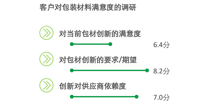 受访者认为,下游客户对包材创新抱有较高期望(当前包材创新的满意度为6.4分,满分10分),尤其关注通过材料和技术创新提升产品的保护性、功能性及成本效率。