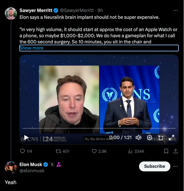 马斯克表示脑机接口有望像智能手机那般价格可以承受。