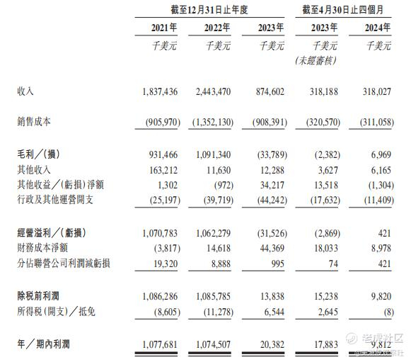 在收入方面,2021 - 2023 年及 2024 年前四月表现出明显的起伏。2021 年公司收入为 18.37 亿美元,2022 年增长至 24.43 亿美元,这一增长主要得益于市场运费的上涨。然而,到了 2023 年,收入大幅降至 8.75 亿美元,主要原因是运费下降以及部分航运营量的轻微减少。2024 年前四月,收入为 3.18 亿美元,与 2023 年同期相比保持相对稳定。