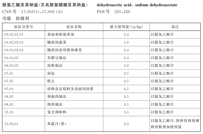 例如,韩国、日本允许脱氢乙酸钠用于黄油、奶酪、人造黄油等食品中,但其用量不得超过0.5g/kg。美国允许脱氢乙酸钠用于切块或去皮南瓜和草莓,其最大使用量不超过65mg/kg。