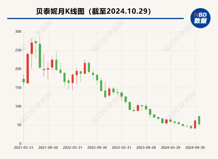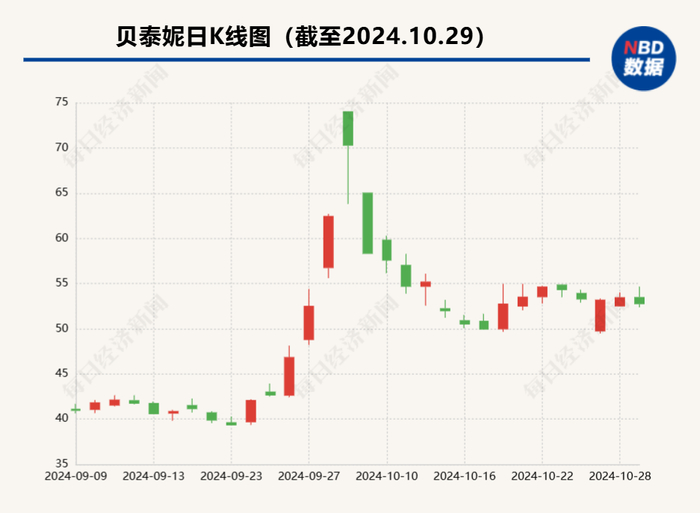 进入9月底之后,贝泰妮走出一波强势反弹:9月23日盘中下探至39.30元/股,10月8日盘中触及74元/股的阶段高点,此后贝泰妮没能延续这一走势。