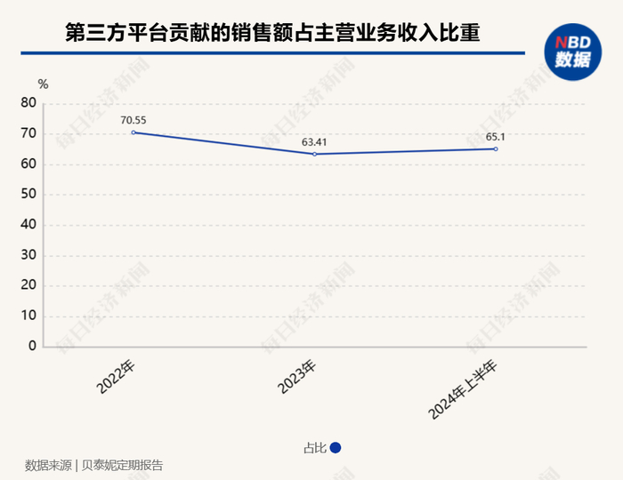 而从渠道方面看,贝泰妮的高速增长离不开对第三方线上平台尤其是“淘系”平台的高度依赖,2022年、2023年及2024年上半年,该比重分别为70.55%、63.41%和65.10%。