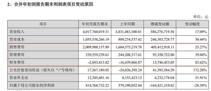 贝泰妮利润出现大幅波动,主要原因在于毛利率下滑和费用升高:一方面,今年前三季度,公司销售毛利率约为73.73%,较上年同期下降约2.69个百分点。另一方面,贝泰妮前三季度销售费用、管理费用、财务费用全面走高,且增幅均超过了营收增幅。其中,报告期内公司销售费用为20.09亿元,同比增长25.27%。可以看到,贝泰妮今年前三季度约一半的收入被用来进行营销。