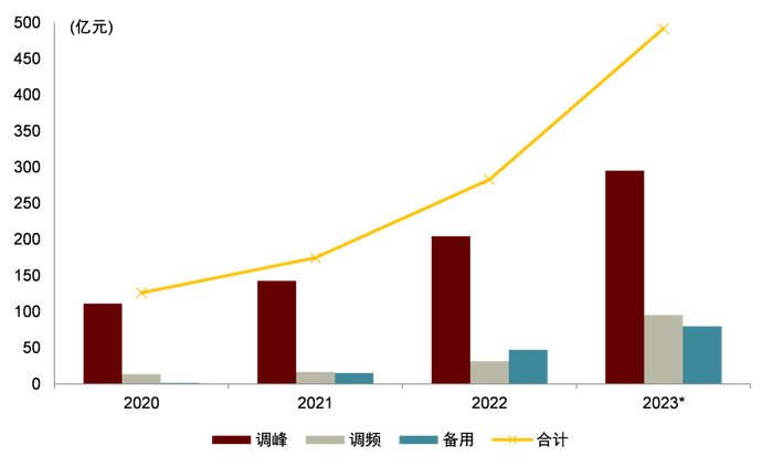 注:2020、2021、2022年数据均来自“2023电力市场春季论坛”,2023年数据根据国家能源局发布的2023年上半年全国电力辅助服务市场费用情况、国网经营区域电费占全国电费比例推算得到。