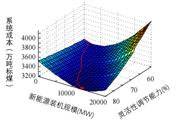 注:这里的系统成本将高比例新能源并网后所产生的相关成本统一折算为标煤,包括:火电机组煤耗及排放、灵活性资源改造、弃风弃光成本等。