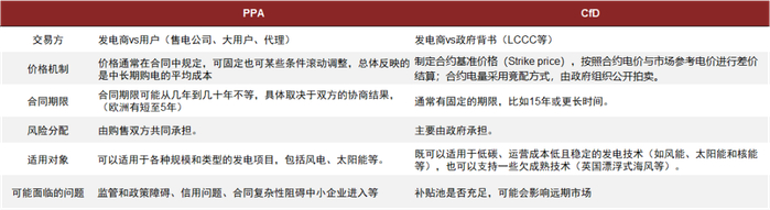 事实上,PPA与CfD的本质类似,都是通过中长期金融合约锁定新能源电站未来10-15年甚至更长的电量收益,从而保障投资者的信心,相当于从原来的政策保障转变为市场化保障;区别主要在于由谁保障,即与新能源开发商的交易方不同,PPA以电力大用户或售电公司为主,CfD则以政府或政府背书的合同管理商为主,相应的价格机制、风险分担方式等也存在一定差异。
